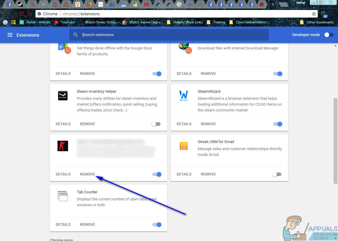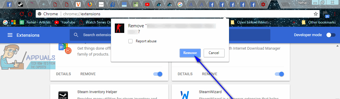 - Locate the extension associated with AdChoices (a surefire tell is that this is going to be an extension you don’t recognize and an extension that looks out of place), click on Remove under its listing and click on Remove in the resulting dialog to confirm the action. If there are any other active extensions that you do not recognize or have any use for, remove them from Google Chrome as well.