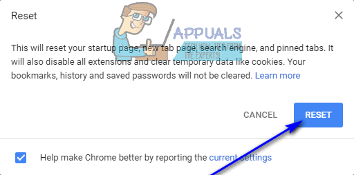 - Click on Reset in the resulting popup to confirm the action and have your Google Chrome slate wiped clean.