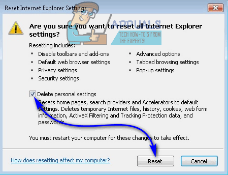 - Enable the Delete personal settings option, and click on Reset to completely reset Internet Explorer to its factory settings.