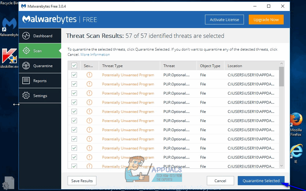 - Once you have the results of the scan in front of you, make sure all of the threats found are selected, and then click on Quarantine Selected.