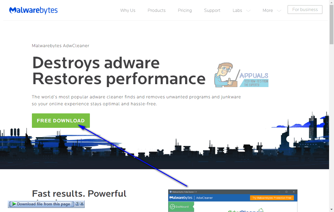 - Go here and click on Free Download to download a portable version of AdwCleaner – a computer security program designed specifically to check for and deal with adware.