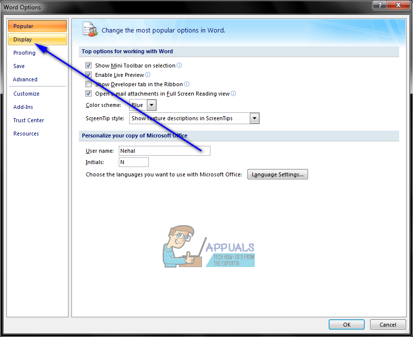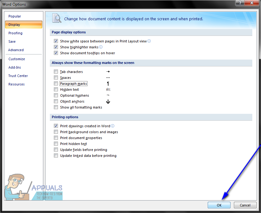 - In the left pane of the Word Options dialog, click on Display.