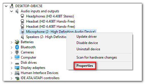 Running Device Manager - Inside Device Manager, expand the drop-down menu for Audio inputs and outputs. Right-click on your microphone device and choose Properties.
