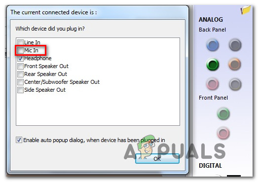 If you’re using a Realtek driver, you’ll get a prompt to identify the device that was plugged in. In this case, check the box for Mic In and hit Ok to save the changes.
