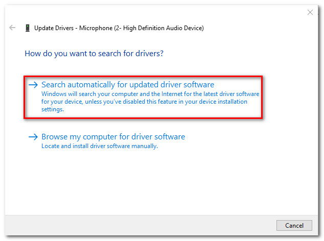 Updating the Microphone driver - At the next screen, click on Search automatically for updated driver software.