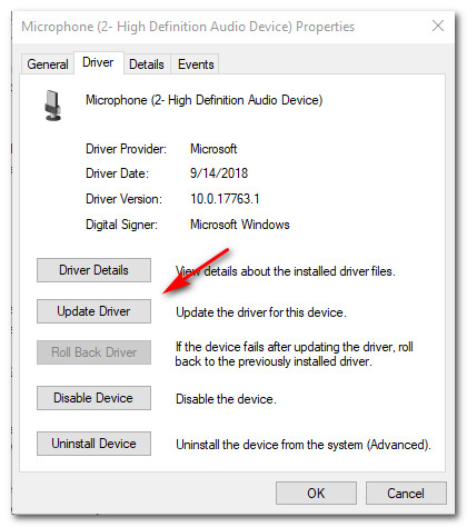 Accessing the Properties options of your Microphone - Inside the Properties screen of your Microphone, go to the Driver tab and click on Update driver.