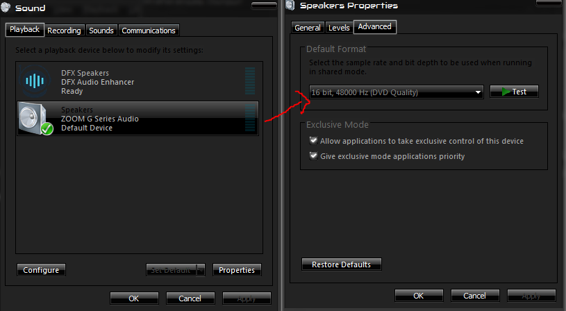 Finally, here in my Sound > Playback Devices settings, you can see my Zoom USB interface is set as the Default Device, and its Default Format is set to the highest possible it can handle, 16 bit / 48000 Hz. Some USB audio interfaces can achieve as high as 24 bit / 192000 Hz, but this is absolutely useless for audio playback – I’ll explain why later.