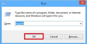 - Press the Win key + R to open the Run dialog box. Type “regedit” in the box next to Open: and hit OK.