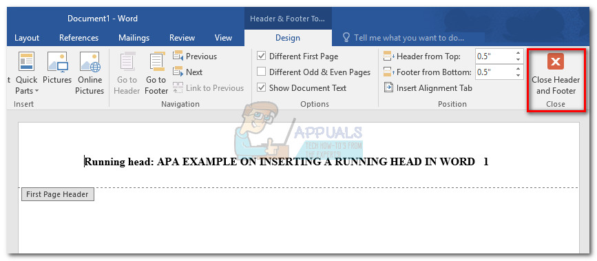 - With the first running head inserted and the first-page number in place, click the Close Header and Footer button.