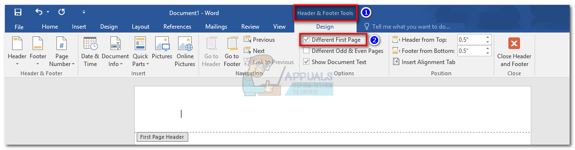 Set Font for Header & Footer of a Word Document - Next, with the first header opened, access the Header & Footer tools and make the box next to Different First Page is checked. Make sure you don’t type anything before you check the box.