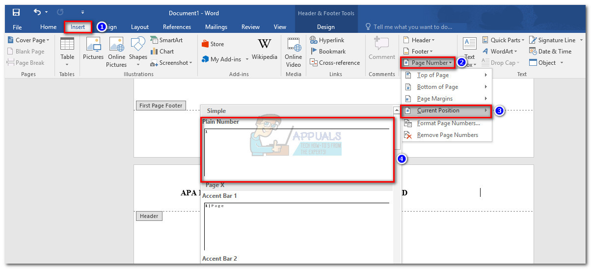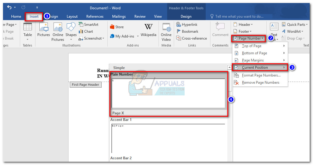 - After you successfully type the running head on the first header, position the cursor to where you want the page number to be inserted. Then, go to the Insert tab and click on Page Number. Next, select Current Position and click on the Plain Number thumbnail. At the end of this process, you’ll notice that page 1 will be inserted automatically.