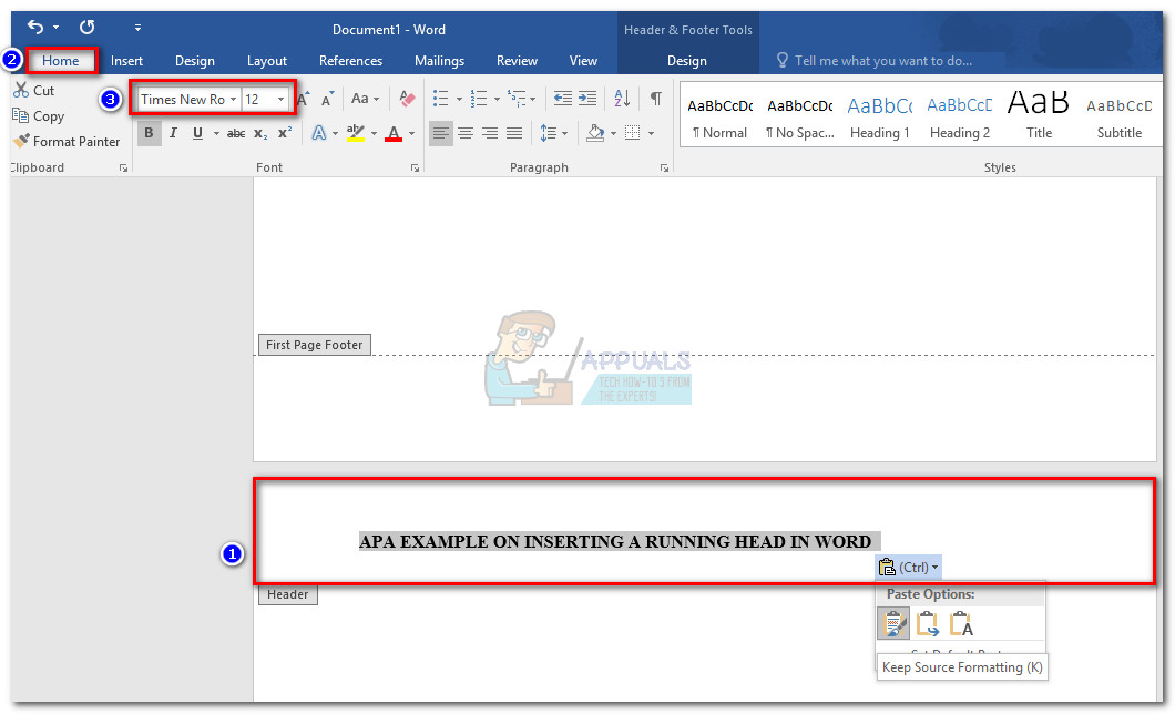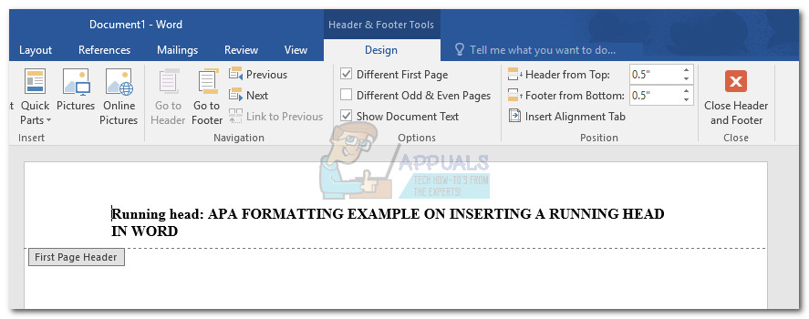 Check Different First Page Option for Header & Footer - In the First Page Header, type “Running head:”, followed by the title of your paper. In this example, our first-page header looks like this: Running head: APA FORMATTING EXAMPLE ON INSERTING A RUNNING HEAD IN WORD.