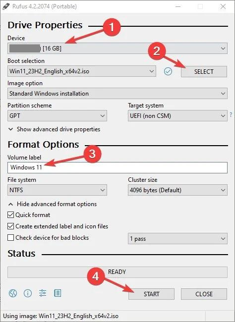 - Start the Process: Press ‘START’ in Rufus and wait for the bootable USB drive to be created.