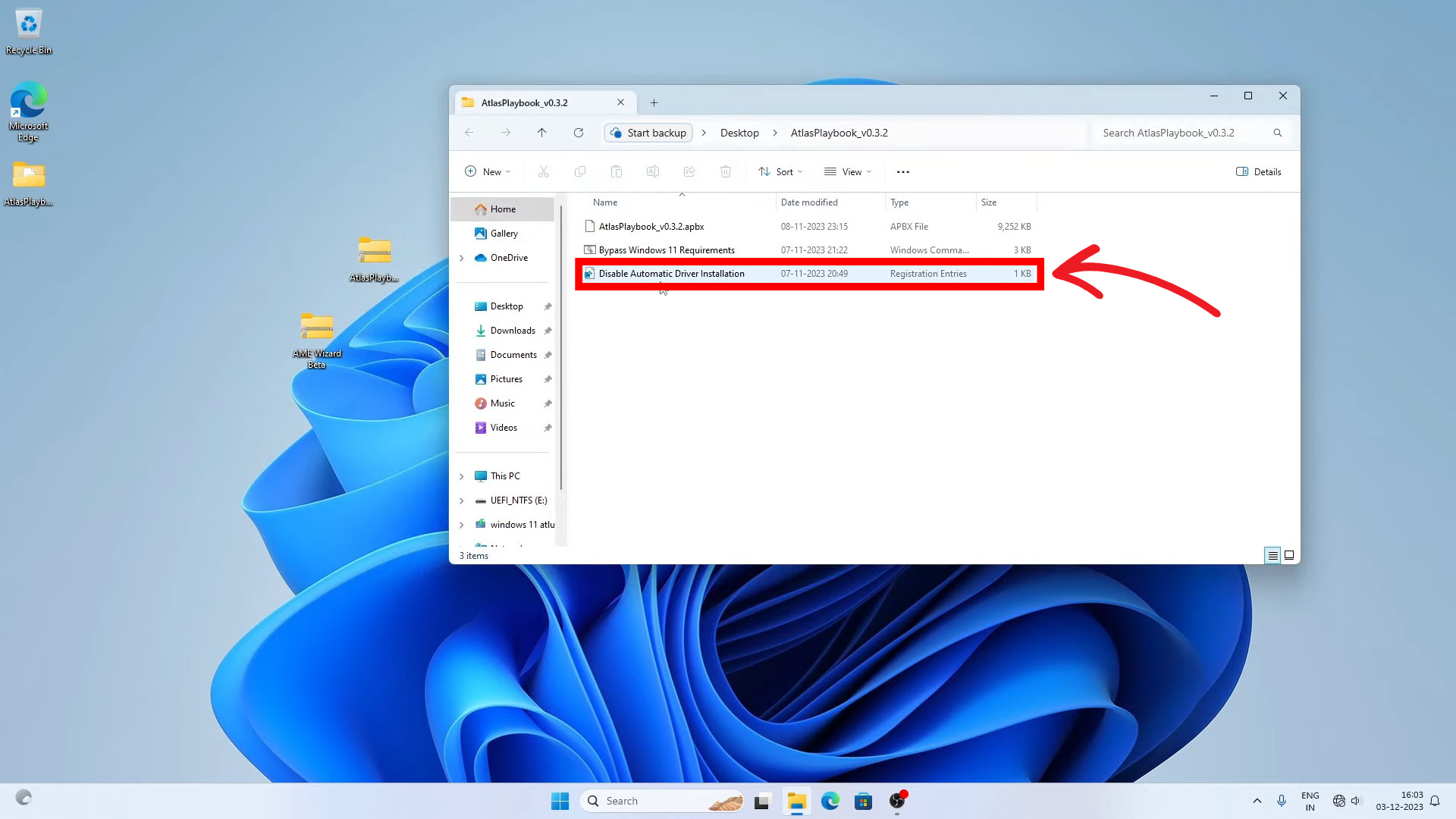 Place the ZIP files on your Desktop for easy access - Before proceeding with the installation process, run the ‘Disable Automatic Driver Installation’ file within the Atlas Playbook folder to prevent the installation of new drivers on your freshly installed copy of Windows 11.