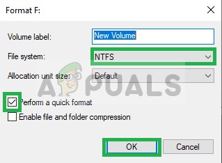 Selecting NTFS and checking quick Format Box - A warning will pop up that will tell you that all the files on the Hard Drive will be lost, select OK if you want to continue