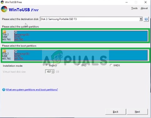 Selecting the External Hard Drive from the drop down - Select your Hard Drive in both “System Partition” and “Boot Partition” Options, make sure Legacy mode is selected and click on “Next”