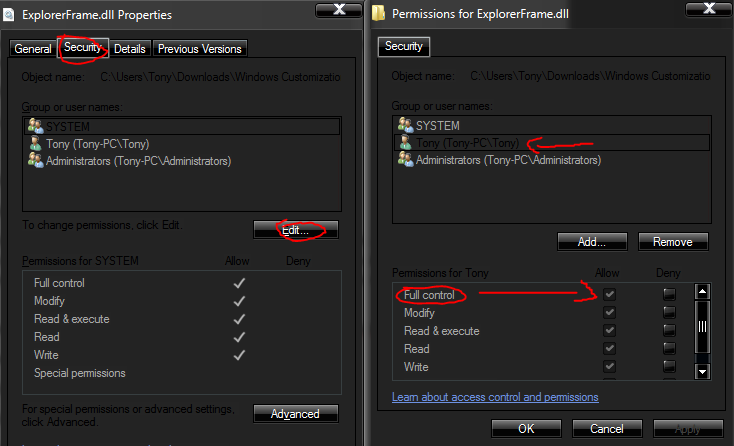 Now you will go into both folders, right-click the ExplorerFrame.DLL files and go to Security tab -> Edit -> highlight your username for your PC -> hit the checkbox for Allow Full Control, as seen below.