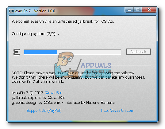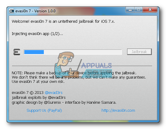 - The app will retrieve information from the iDevice to generate jailbreak data. Then it will upload the data, inject evasi0n app 1, inject evasi0n app 2, configure system 1, configure system 2, and finally reboot.