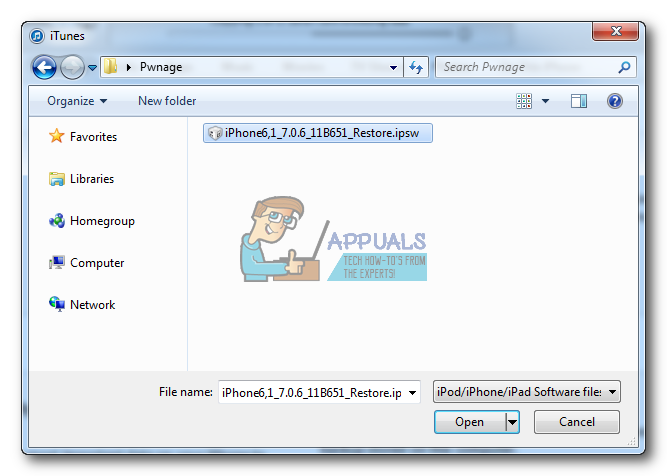 - A popup window will appear. Select your iPhone firmware file (ipsw) from the Pwnage folder you created on the desktop and click Open.