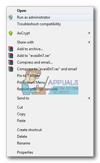 - Once the restore has successfully finished, right–click the evasi0n7.exe. Now, choose Run as Administrator from the contextual menu, to launch the program.