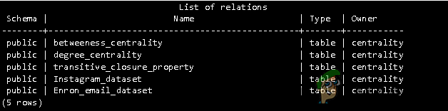 Type the command “\dt” to list all tables in a current database.