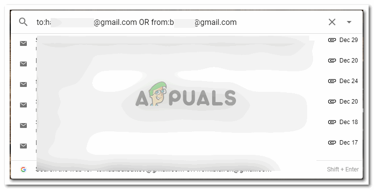 Another way to write in the search field The minute you start typing in the search field on Gmail, you will see suggestions from Google appear under the search field. It is possible that you will find the email that you have been looking for here. But in case you don’t, you can always press the enter button as soon as you are done writing the email addresses in the format as mentioned above. Pressing the enter key will direct you to all the emails from or to these email addresses, making your search even easier.