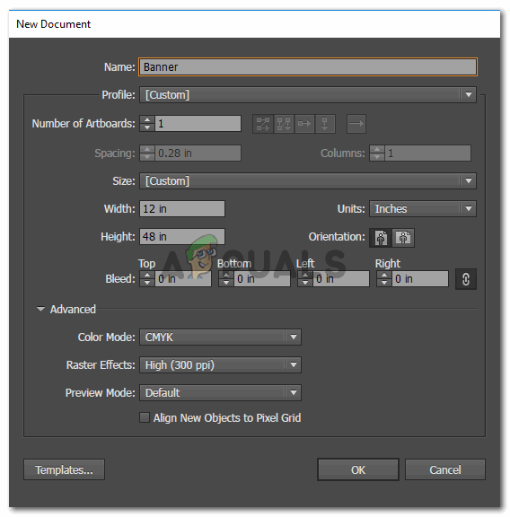 - Open Adobe Illustrator and fill in the details for dimensions for your artboard. Since it is a banner, you need to be very sure about the size of the banner. The design cannot be printed on a larger scale if the design has been made on a smaller scale. I have used 12 inches for my banners width and 48 inches for the height. If you want to make something smaller than this size, you are always free to customize the settings accordingly.