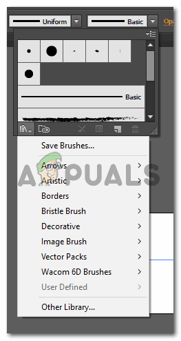 Click on this icon. This is the line tool. You can draw lines on your artboard using this tool. - Before I created a line on the artboard, I used the top panel for tools, which showed me more options for the line tool. Here, in front of the heading for stroke, you will find these two options for the stroke, Uniform, and Basic. You need to click on the downward facing arrow for Basic. This will now show you all the strokes which you can use instead of the basic type of stroke. Now when you open this panel, you will not find many options here. For better and more interesting options, you need to click on the tab that looks like a bunch of books, this is the library.
