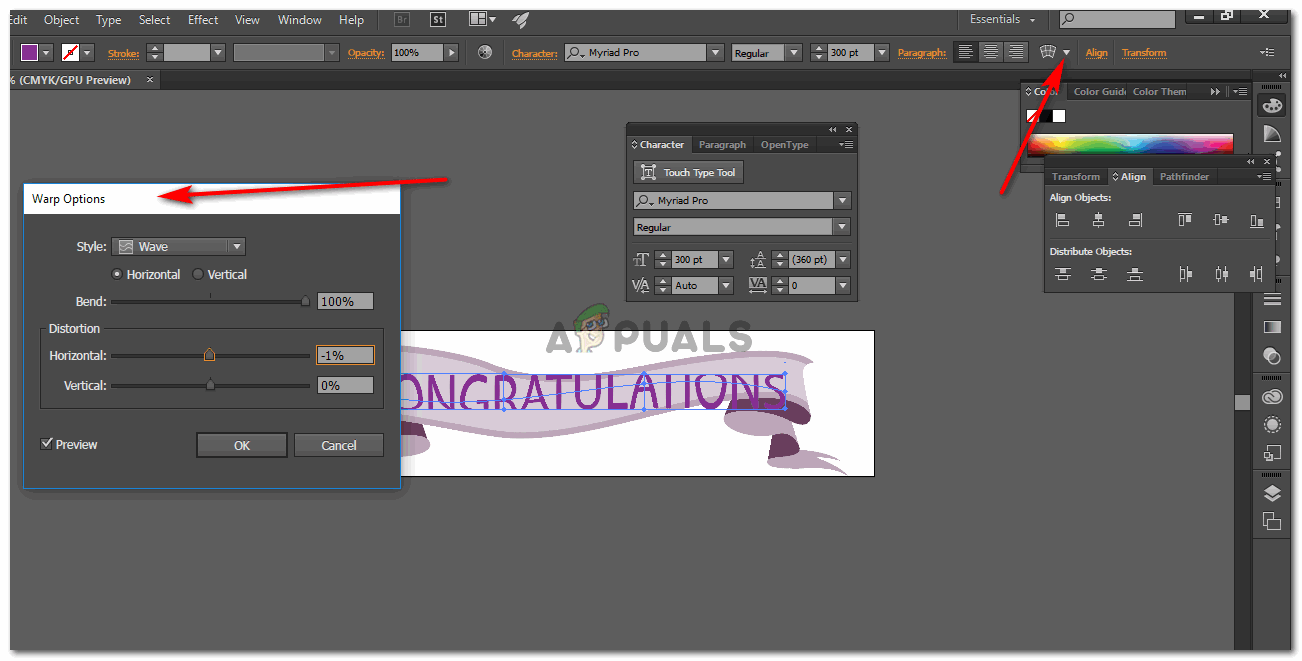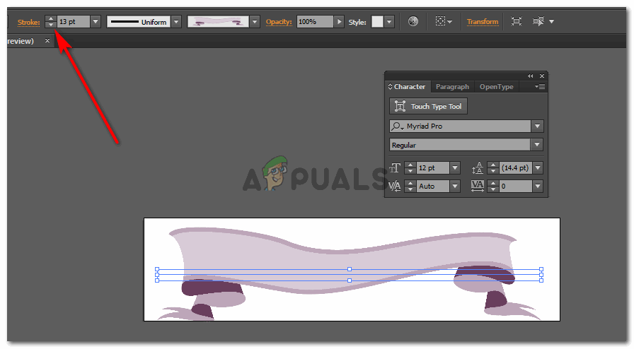 Use the points of stroke to adjust the stroke. Increase the number would widen the stroke as shown in the image - Add whatever text you have to add, using the Text tool, which is a big T on the left tools panel. Once you have added the text, an icon for Warp will appear on the top right corner of your screen. Use that, experiment and see which kind of warp looks the best on your text. Warp basically adds a curve to your shape or text.