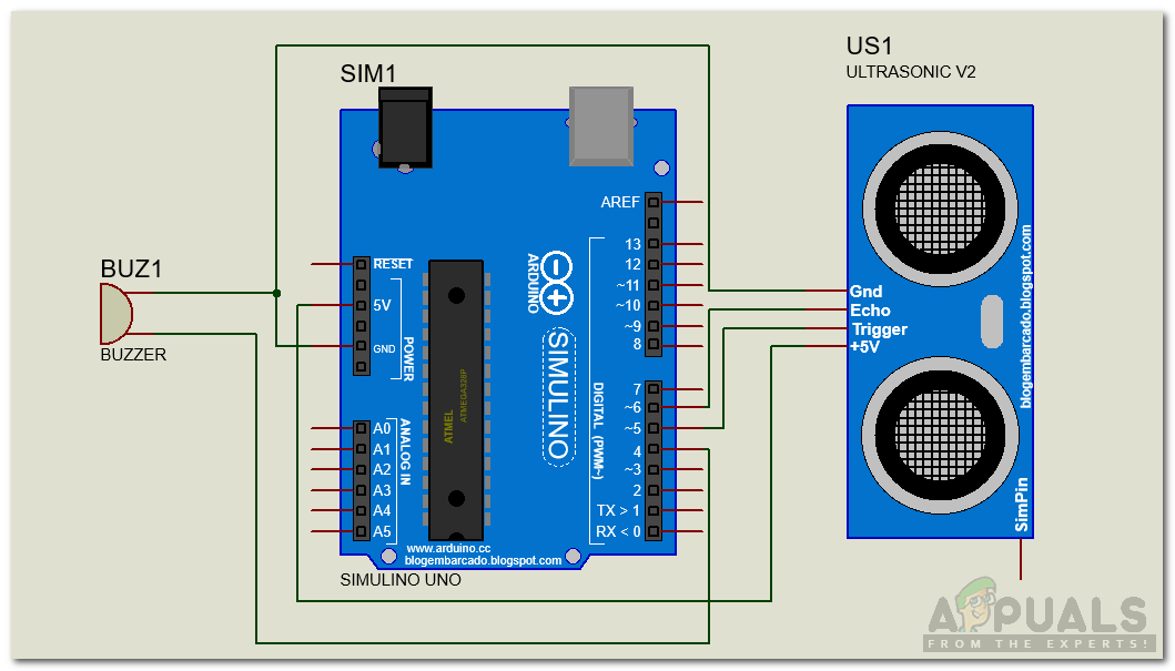 Now, as we know how the components work, let’s go ahead and assemble theses components together and make a circuit as shown below. The Ultrasonic sensor is powered by 5V through Arduino, its trigger pin connected to the Pin5 and Echo pin s connected to the Pin6 of the Arduino. The buzzer is connected to the Pin4 of Arduino.