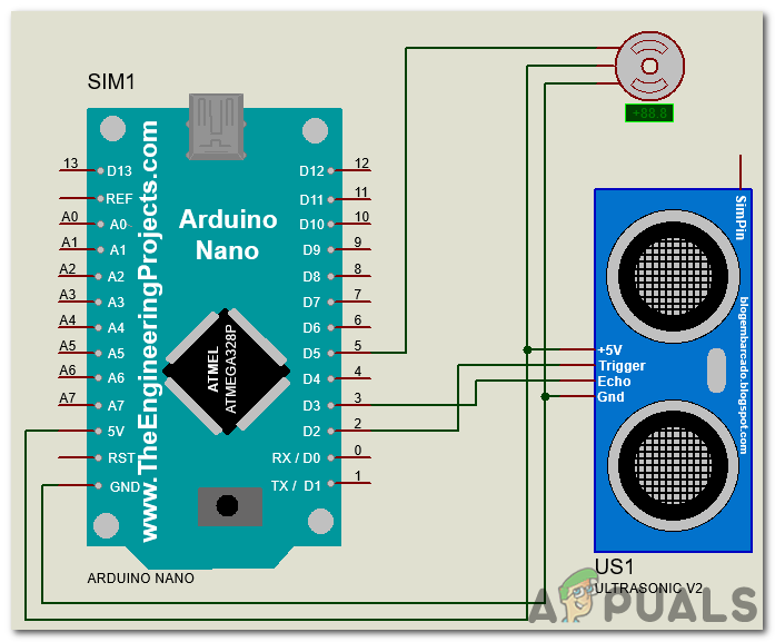 - Now make all the connections through connecting wires. Connect the Vin and the ground of the motor and the ultrasonic sensor to the 5V and ground of Arduino. Connect the trigger pin of the sensor to the pin2 and the echo pin to the pin3 of the Arduino. Connect the PWM pin of the servo motor to the pin5 of the Arduino.