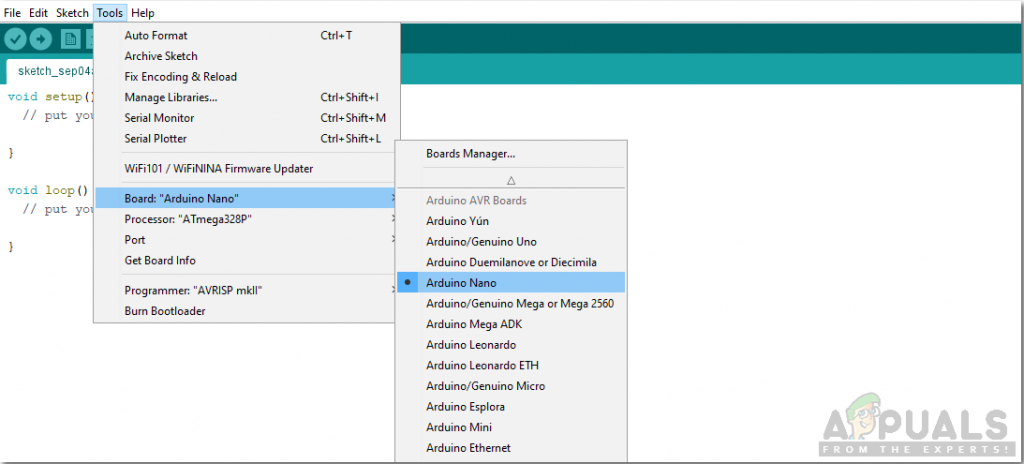 Finding Port - Click on the Tool menu and set the board to Arduino Nano.