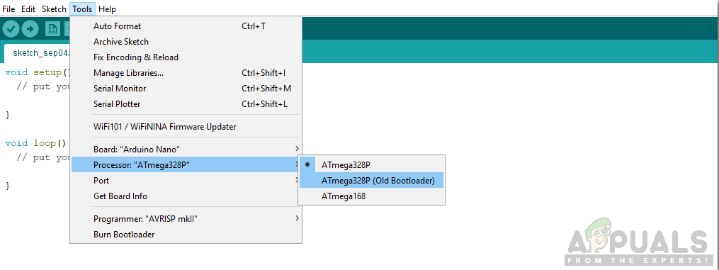 Setting board - In the same Tool menu, Set the Processor to ATmega328P (Old Bootloader).
