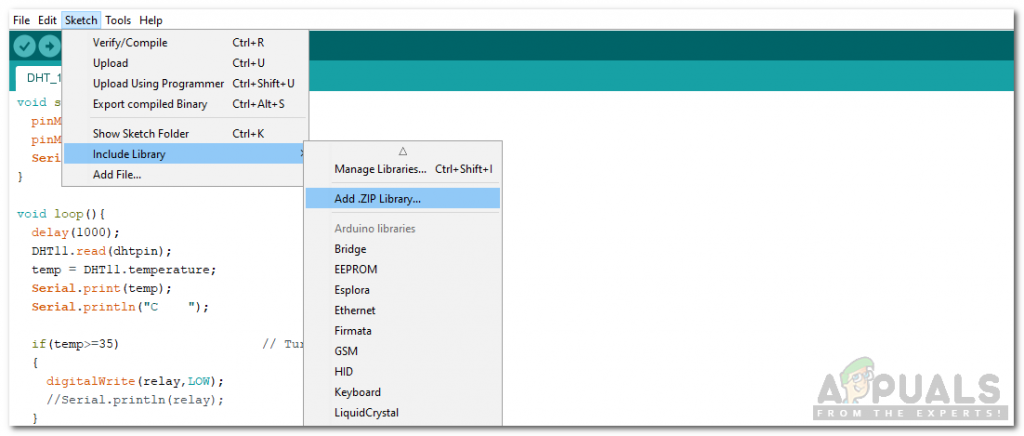 Setting Port - We will have to include a library to use the DHT11 sensor. The library is attached below in the download link along with the code. Go to Sketch > Include Library > Add .ZIP Library.