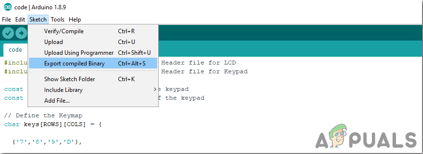 Setting Port - Now, to use 4×4 keypad and the 16×2 LCD with Arduino IDE, we need to import special libraries that will allow us to burn code on Arduino Uno and use it. these two libraries are attached in the link given below. To include the library, goto Sketch > Include Library > Add ZIP Library. A box will appear. Find the ZIP folder on your computer and click OK to include the folders. This library is attached along with the code in the link below.