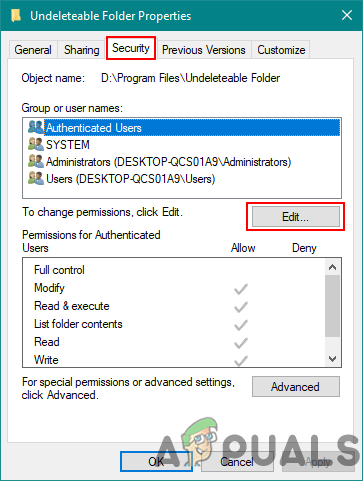 Opening properties of the folder - Select the Security tab and click the Edit button. A new permission Window will appear with options enabled.