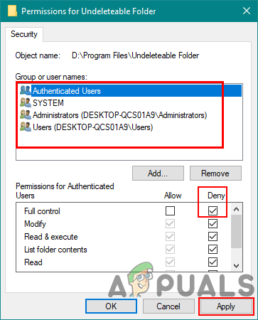 Deny all groups - Once you are done, click Apply, Click Ok for both windows and you are done.