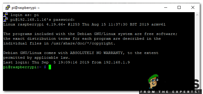Configuring Putty - Logging In: After entering the IP address the screen will appear and it will ask for username and password. The default username is “pi” and password is “raspberry“. We can change login details too if we want.