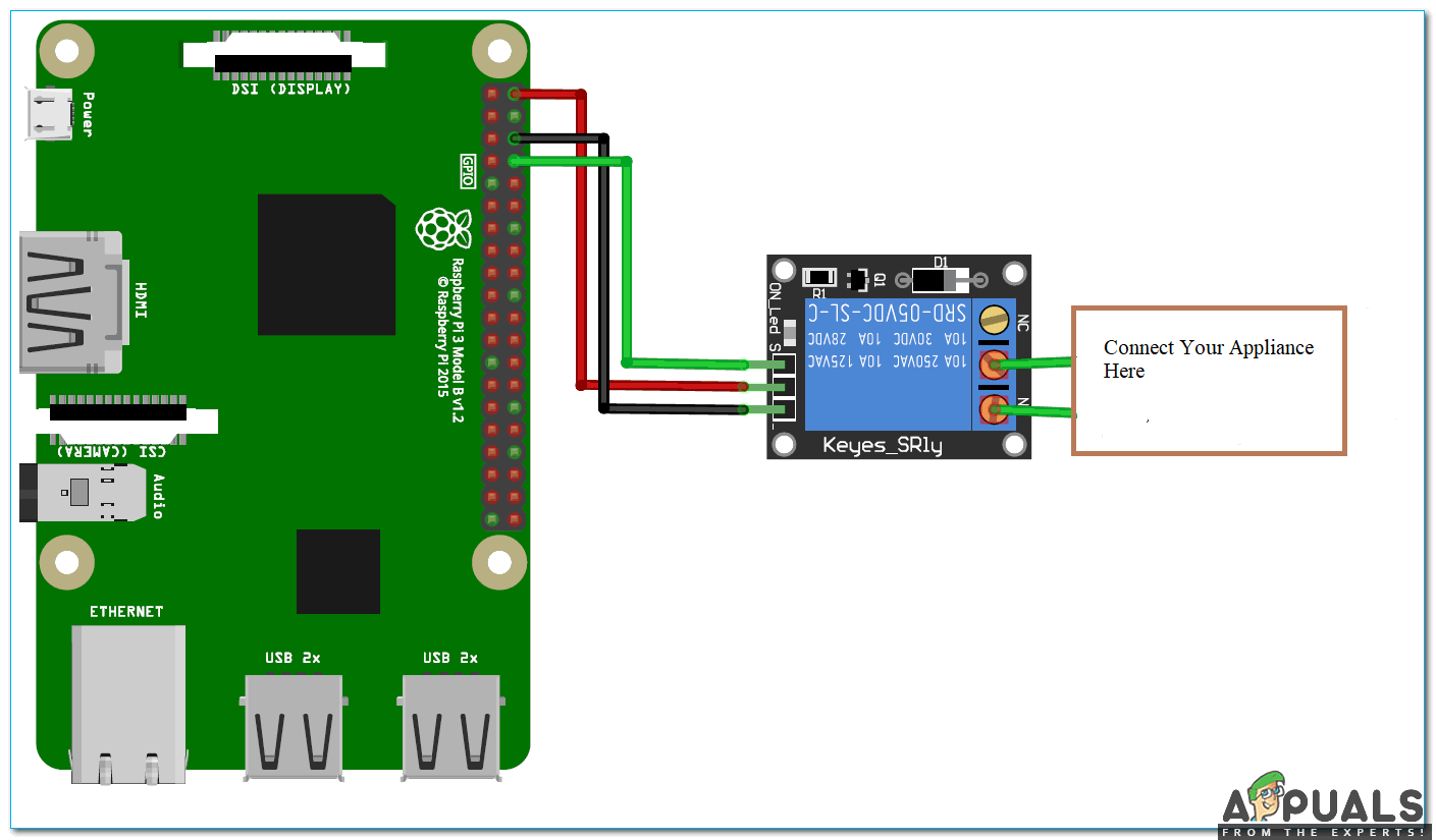 Relay is powered by 5 V of Raspberry Pi and General Purpose Input Output (GPIO-14), is connected to the IN of the relay. It will tell the relay when to switch ON and OFF. We have connected 12V AC bulb to the output of the relay so that when the garage door is opened bulb is turned ON and when the garage door is closed the bulb is turned OFF.