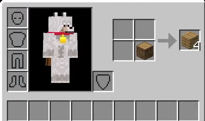 Open up the crafting menu - Next, put 2 wood blocks in the crafting slot. This will give you 8 wooden planks. Place them in your inventory.