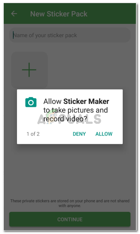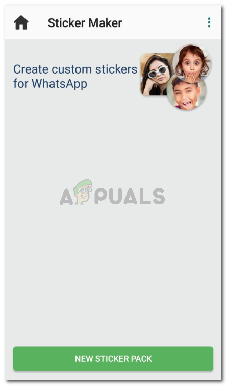 This is what the app looks like. - To begin creating your own stickers for Whats App, you need to tap on the green tab at the end of the screen which says ‘New Sticker Pack’, as shown in the image above. Once clicked, the app will now ask permission for accessing images from your Gallery.