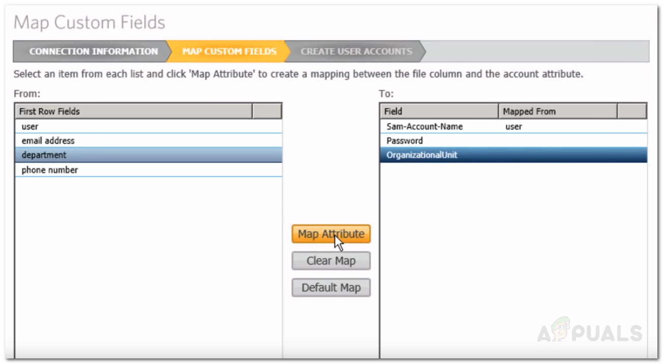 4. On the Map Custom Fields page, you can map the fields in your import file with what is available in the Active Directory.