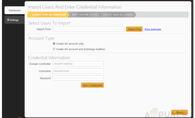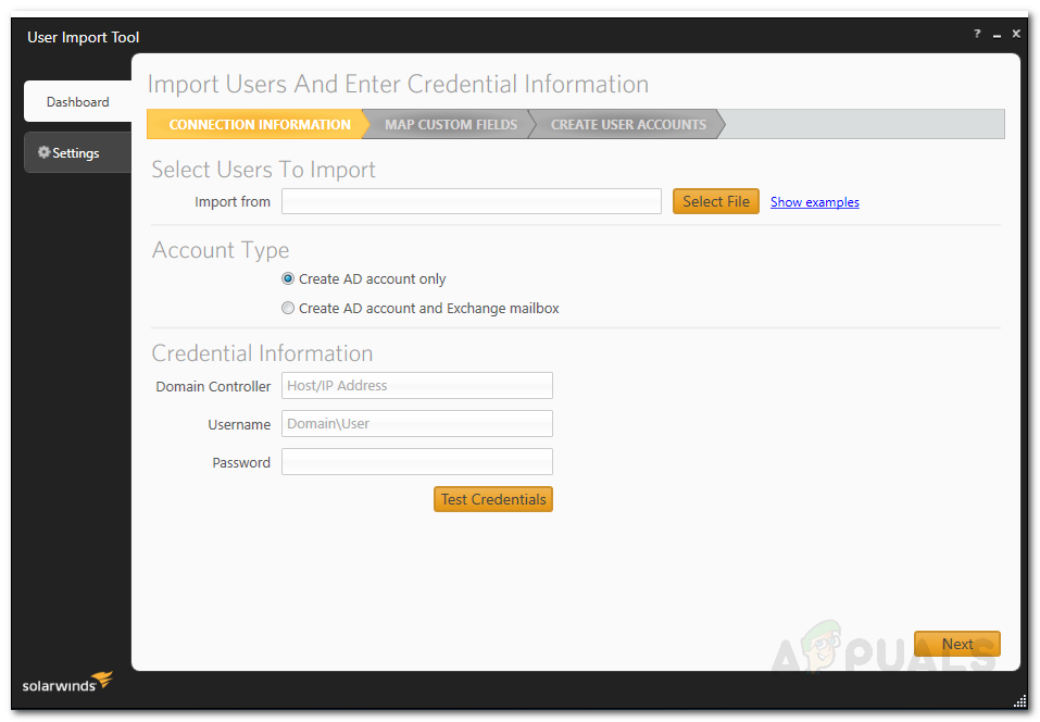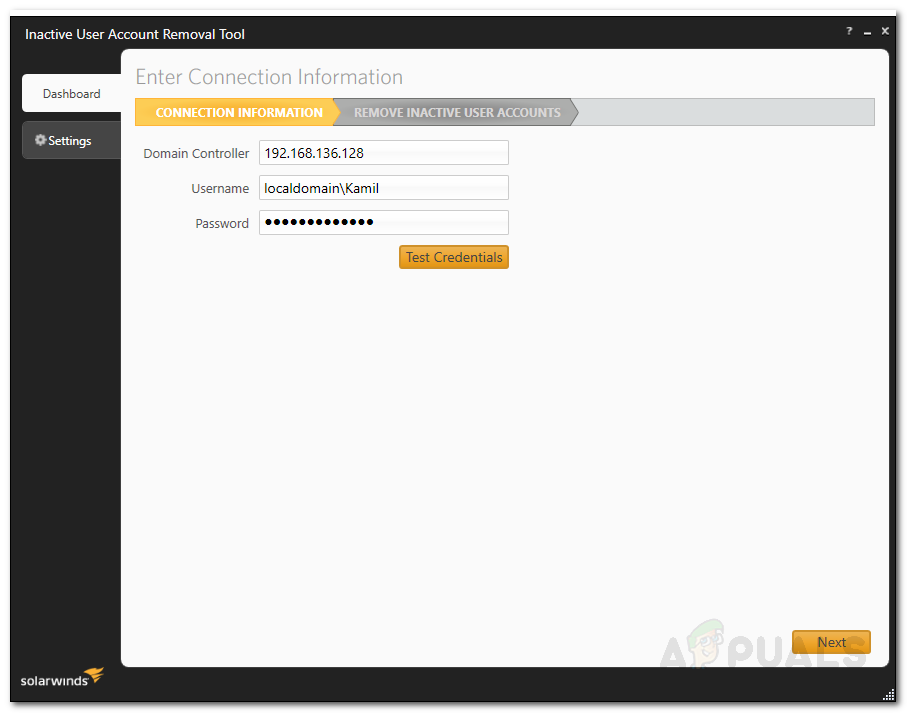 2. Once the tool starts, you will be asked for the Domain Controller, username and password. Fill in the required fields and then hit click Next.
