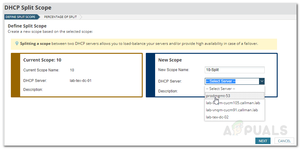 Defining Split Scope - Select the server for which you are trying to split the range and then click the Next button.