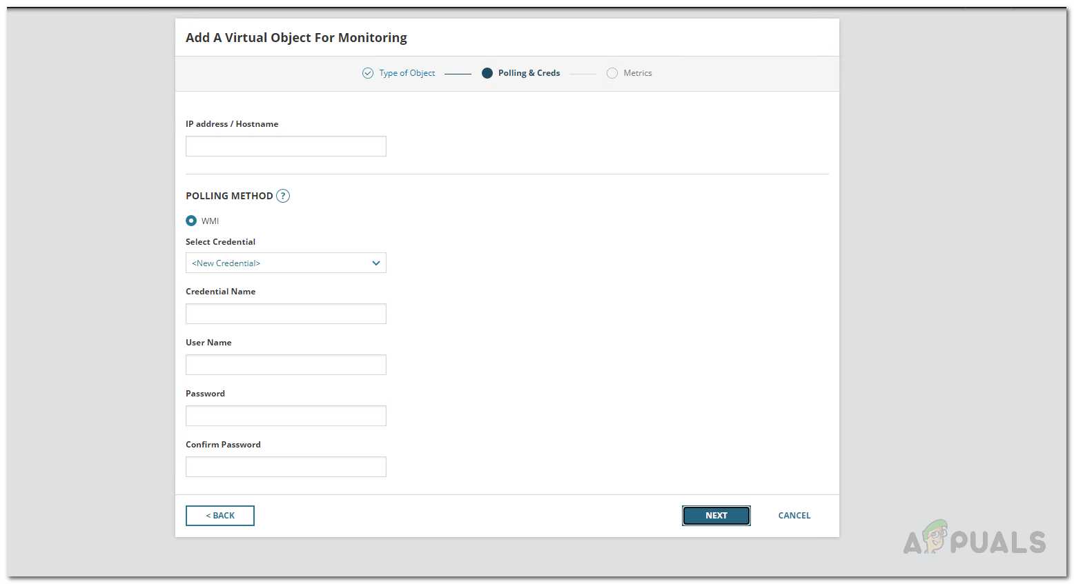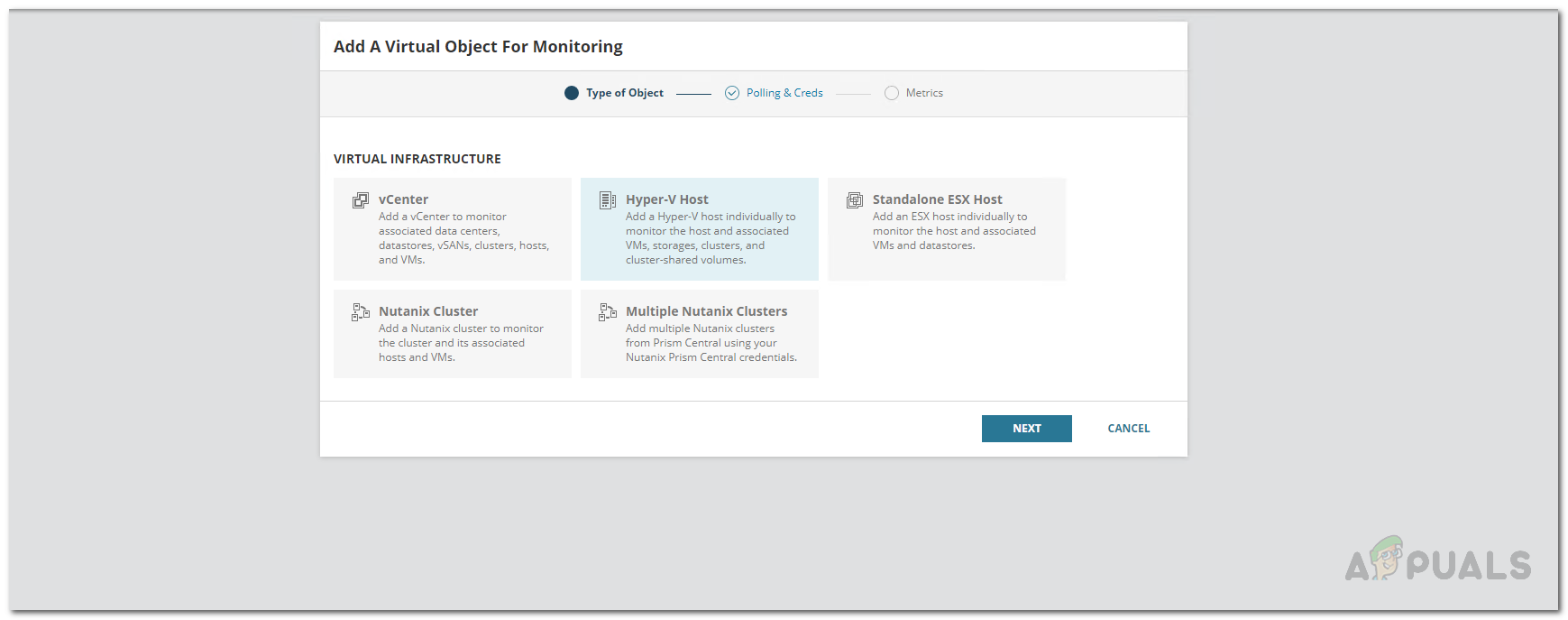 Adding Hyper-V Host to Virtualization Manager - On the Polling and Creds tab, provide the IP address of the virtual machine and then follow it up with providing the required credentials of the account that is to be used to collect the data. You will have to make sure that the account that you are providing has Remote Enable and Account Enable permissions. After that, click Next.