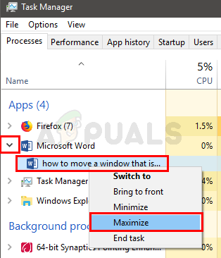 Note: This method will not work for the latest version of Windows 10. The option to maximize the window via Task Manager is not available in the latest versions of Windows 10.