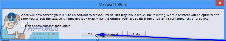- Word will display a message stating that it will now convert the selected PDF file into an editable Word document and that you may lose some substance or formatting as a result, especially if the selected PDF file is graphics-heavy. Word will also inform you that the process may take some time. Click on OK.