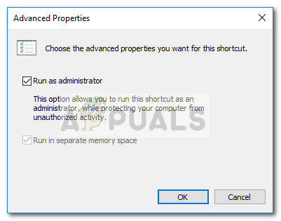 - In the Advanced Properties window, check the box next to Run as administrator and hit OK. Finally, click on Apply to save the changes.