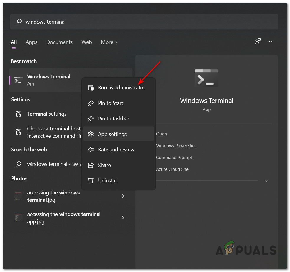 - Next, right-click on Windows Terminal from the list of results and click on Run as Administrator from the context menu.