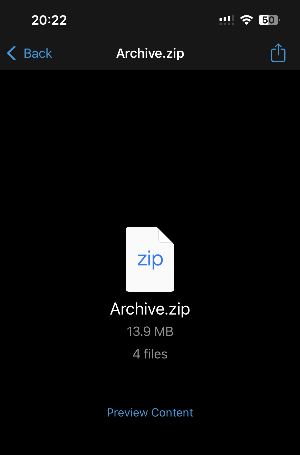 The “Preview Content” screen on iOS 12 or earlier, or when you open a ZIP file from another app